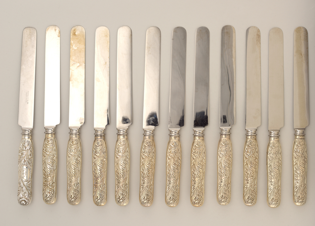 On blade, stamped: [1] Tiffany & Co [2] New York On neck of handle, on each side moving counter-clockwise, stamped: [1] Tiffany & Co [2] Makers [3] Sterling [4] m (mark for Edward C. Moore)