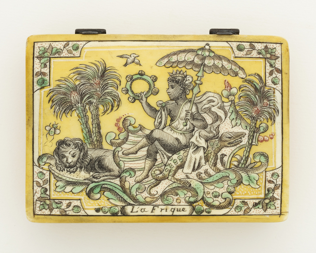 This is a Box and game pieces. It was after Marten de Vos. It is dated late 17th century and we acquired it in 1960. Its medium is engraved and stained ivory. It is a part of the Product Design and Decorative Arts department.
