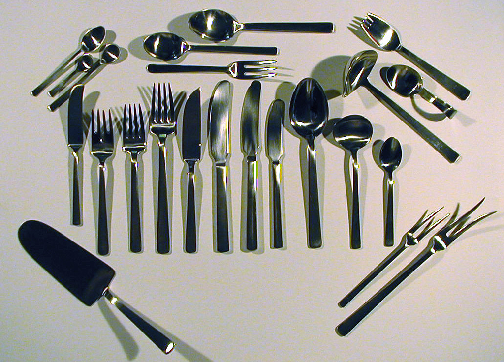 On reverse of shaft stamped: symbol for designer, "KAY BOJESEN/ STAINLESS DENMARK/ COPYRIGHT", a crown with a cross. Exceptions: (g-l, p,q, t-v, y, z) some spoons engraved, not stamped.