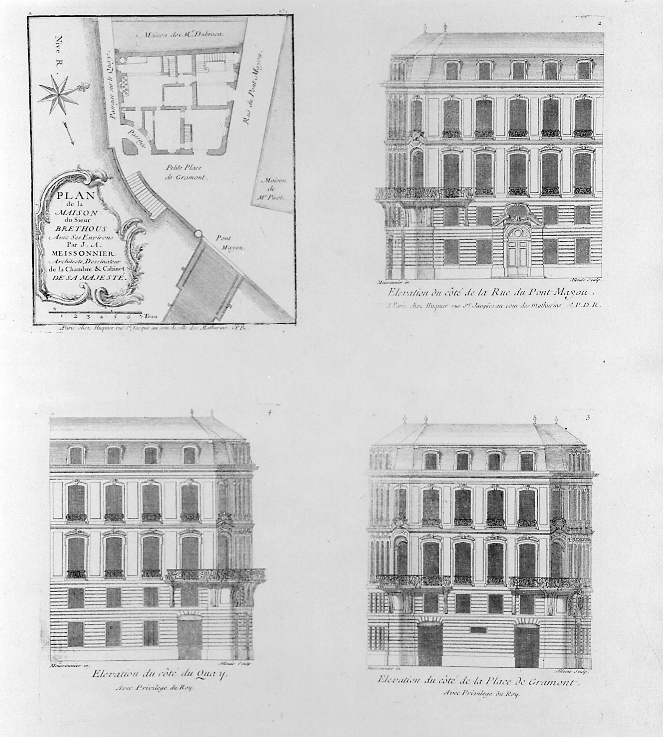 Numbered upper right, in plate : 2; lettered lower center, in plate: Elevation du côté de la Rue du Pont-Mayou.