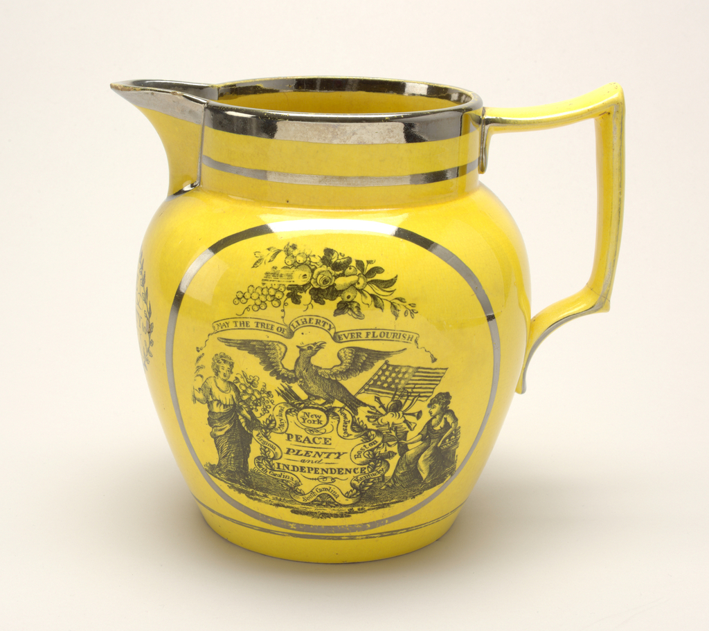 This pitcher is an example of yellow ground ware, which was produced by Spode and other English factories and exported to continental Europe starting in the late 18th century. The demand abroad inspired production in France, most notably at Creil, which lends its name to this type of work, as well as at Sèvres. The black transfer-printed decoration relates to prints of the day.