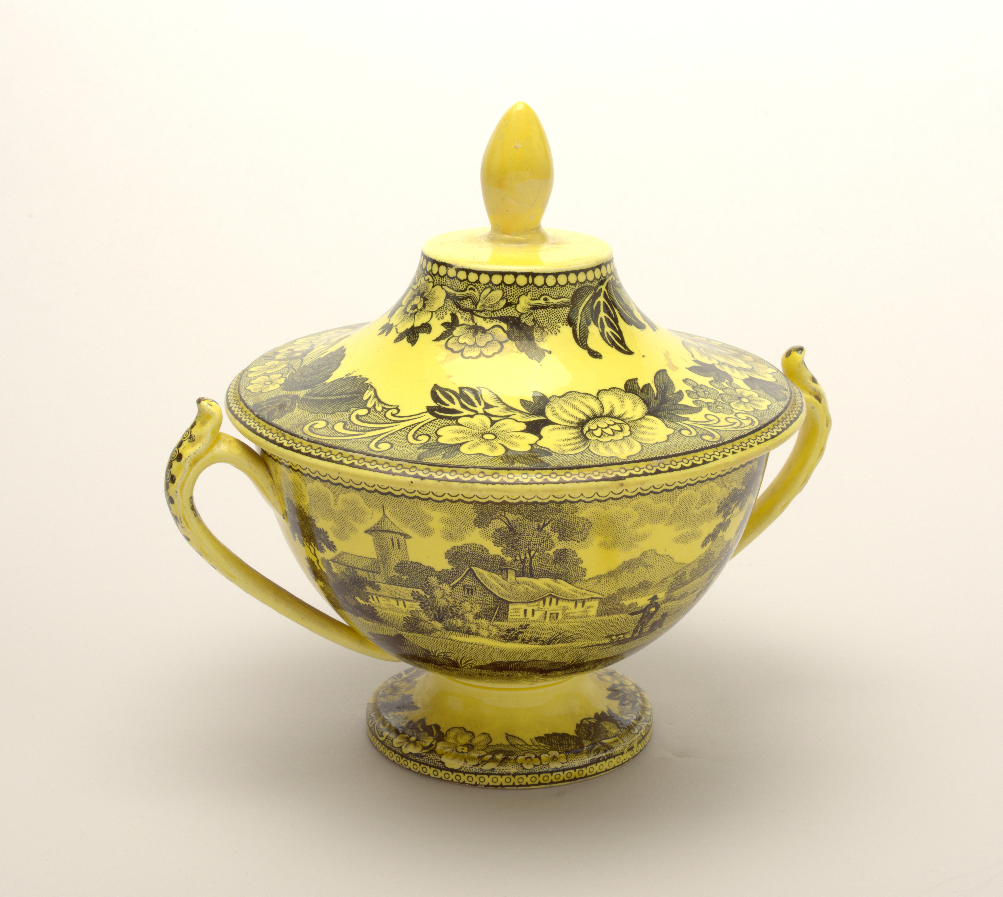 This is a Bowl with cover. It is dated 18th–mid-19th century and we acquired it in 2006. Its medium is glazed earthenare, transfer printed decoration. It is a part of the Product Design and Decorative Arts department.