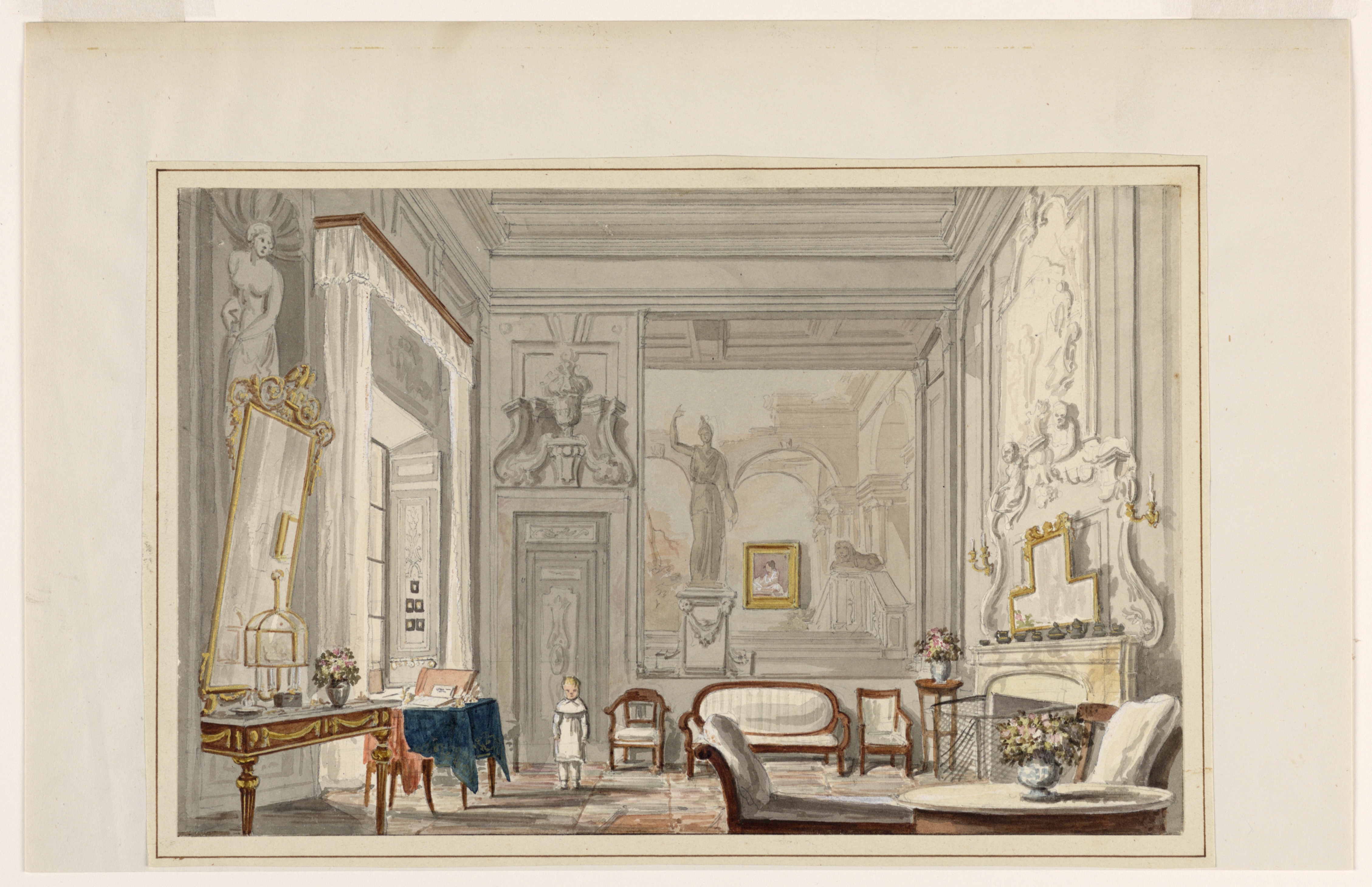 The Thaw gift under consideration would complement interior watercolors already in the museum's collection. The two most important of these, in terms of quality and significance, are the Frederick Crace & Sons drawing, Design for the Decoration of the Saloon, Royal Pavilion, Brighton, ca. 1815 (1948-40-25-a), and Apartments of Queen Elizabeth of Prussia in Charlottenburg Palace in Berlin, 1864 (1957-98-2), executed by Elizabeth Pochhammer. Additional holdings include Russian Interior, 1858 (1953-145-1) by Andrej Redkovskj and View of a Morning Room Interior, 1820–25 (1938-57-66), by an unknown French artist. In addition, the Thaw collection of 19th-century interiors would further help to place other drawings and prints of furnishing objects as well as three-dimensional objects already in the collection within the context of a fully developed domestic interior.