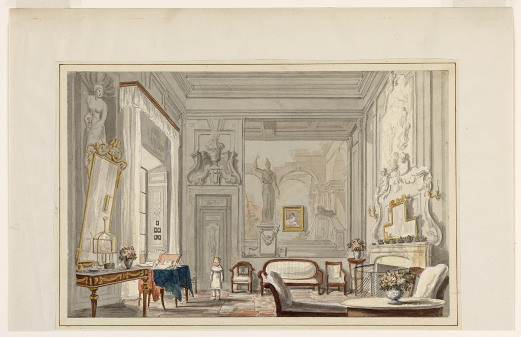 On the whole, these watercolors are not “before-the-fact” presentation studies that would have been executed for a client’s approval. Instead, they are snapshots of interior views; in many examples, people are shown inhabiting the spaces. According to Charlotte Gere, who prepared the 1992 exhibition catalog introduction of the Thaw collection, some interior portraits were executed in the late 18th century, but such drawings became very popular around 1820 with publications such as Thomas Hope’s Household Furniture and Interior Decoration (1807) and John Nash’s Views of the Royal Pavilion at Brighton (1826) in England; and with Charles Percier and Pierre-François-Léonard Fontaine’s Recueil des décorations intérieures (1801–12) in France. These and other books modeled on them created a fad for English, French, and Russian aristocracy to commission watercolors of their palace interiors for display in albums rather than for hanging on walls. Queen Victoria herself was an avid collector of such drawings.
