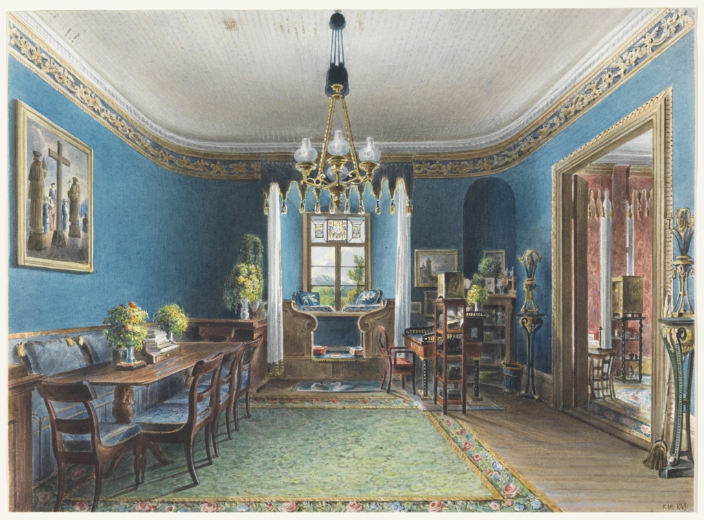 On the whole, these watercolors are not “before-the-fact” presentation studies that would have been executed for a client’s approval. Instead, they are snapshots of interior views; in many examples, people are shown inhabiting the spaces. According to Charlotte Gere, who prepared the 1992 exhibition catalog introduction of the Thaw collection, some interior portraits were executed in the late 18th century, but such drawings became very popular around 1820 with publications such as Thomas Hope’s Household Furniture and Interior Decoration (1807) and John Nash’s Views of the Royal Pavilion at Brighton (1826) in England; and with Charles Percier and Pierre-François-Léonard Fontaine’s Recueil des décorations intérieures (1801–12) in France. These and other books modeled on them created a fad for English, French, and Russian aristocracy to commission watercolors of their palace interiors for display in albums rather than for hanging on walls. Queen Victoria herself was an avid collector of such drawings.