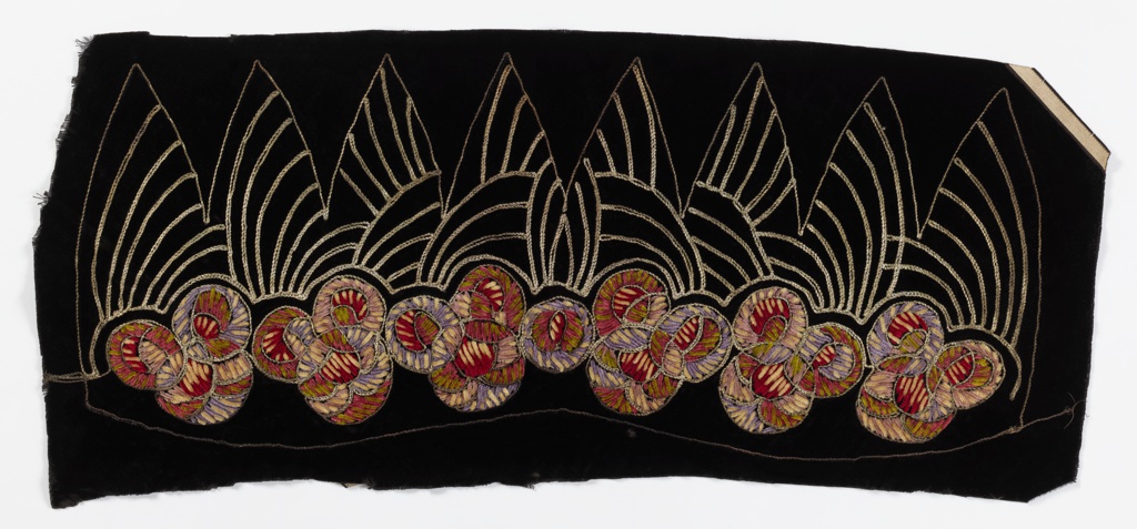 Embroidery Sample (USA); Designed by Alberto Fasola (1892 – 1978); Manufactured by Rialto Art Embroidery; rayon, chenille yarn, metallic thread; Gift of the Budeiri Family in memory of Alberto Fasola; 2007-17-2