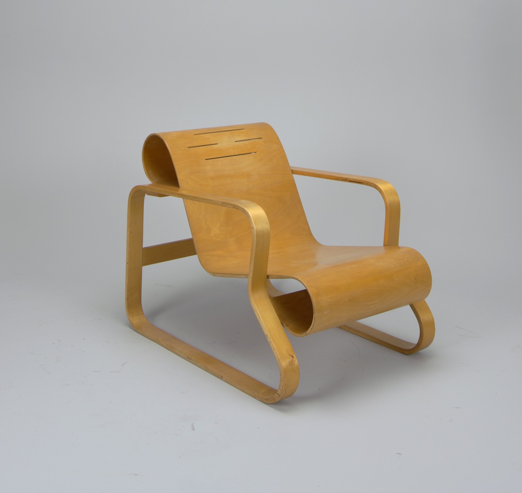 This armchair for the Paimio Sanatorium lounge was designed with its back angled to help sitters breathe more easily. Aalto’s intention was to create furniture that was more comfortable than the “new” tubular metal furniture considered suitable for institutional use and created by his contemporaries including Marcel Breuer, Ludwig Mies van der Rohe, and Charlotte Perriand. Although Aalto was influenced by these designers, and even used some of their furniture in his own home, he felt that chromed tubular steel was sanitary and durable but, “. . . psychophysically [this material was] not good for the human being. The sanatorium needed furniture that . . . was better for the human touch and more suitable as the general material for the long and painful life in a sanatorium.”