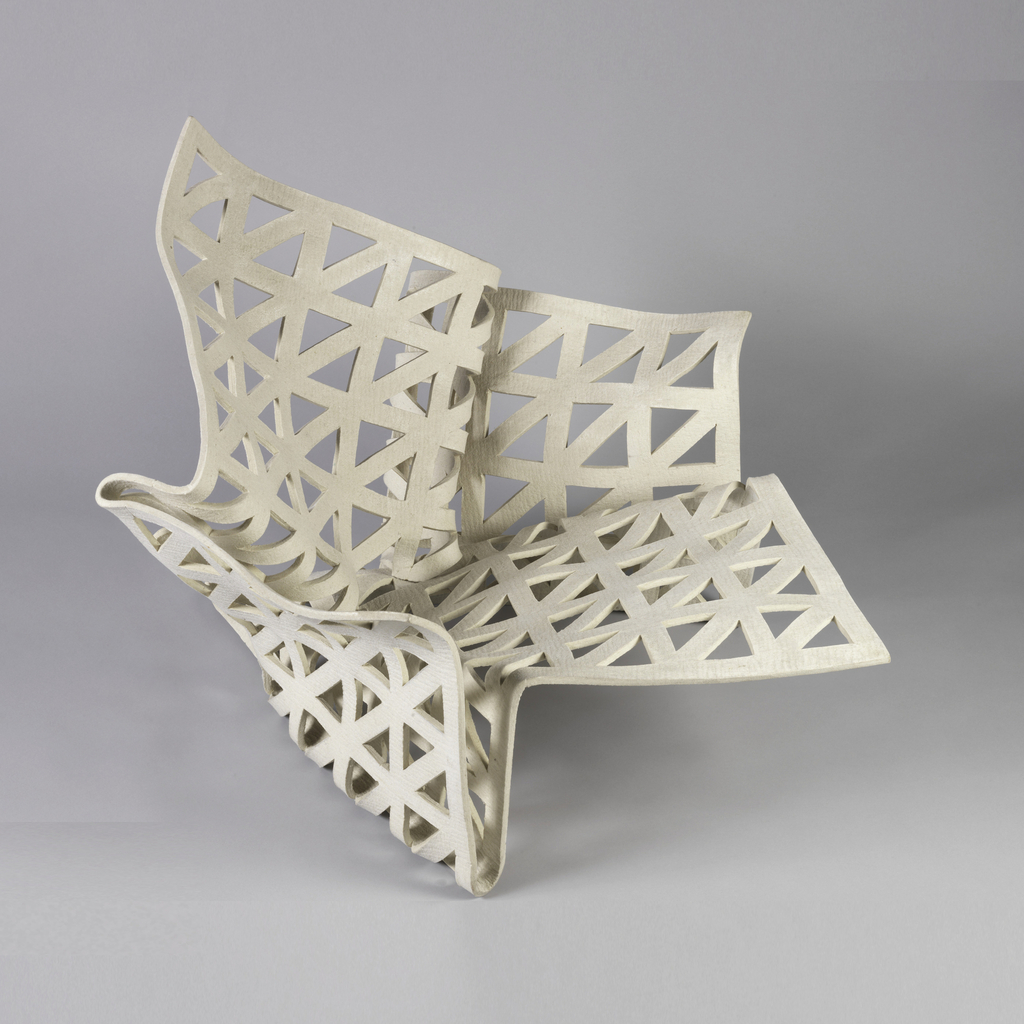 The Bless You chair is a one-off production designed by Louise Campbell that combines technical felt making and an understanding of structure with a personal approach to form. The form, inspired by a crumpled handkerchief, is achieved by suspending a single sheet of gelatin-soaked felt from a carefully plotted group of strings.