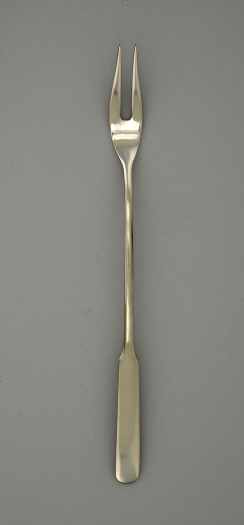 This is a Cold meat fork. It was designed by Donald A. Wallance. It is dated mid-20th century and we acquired it in 1991. It is a part of the Product Design and Decorative Arts department.