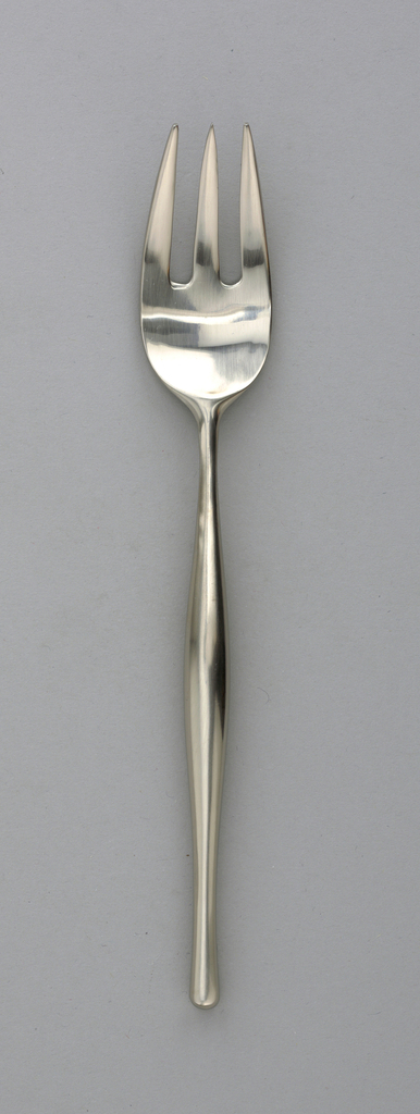 This is a Salad/desert fork. It was designed by Donald A. Wallance. It is dated mid-20th century and we acquired it in 1991. It is a part of the Product Design and Decorative Arts department.
