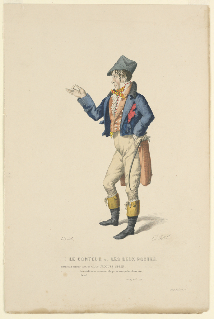 Unknown, Baptiste Cadet as Jacques Splin, in "Le Conteur" or "Les Deux Postes"; After Edouard Follet; engraving, hand colored; Gift of Unknown Donor; 1980-32-1814