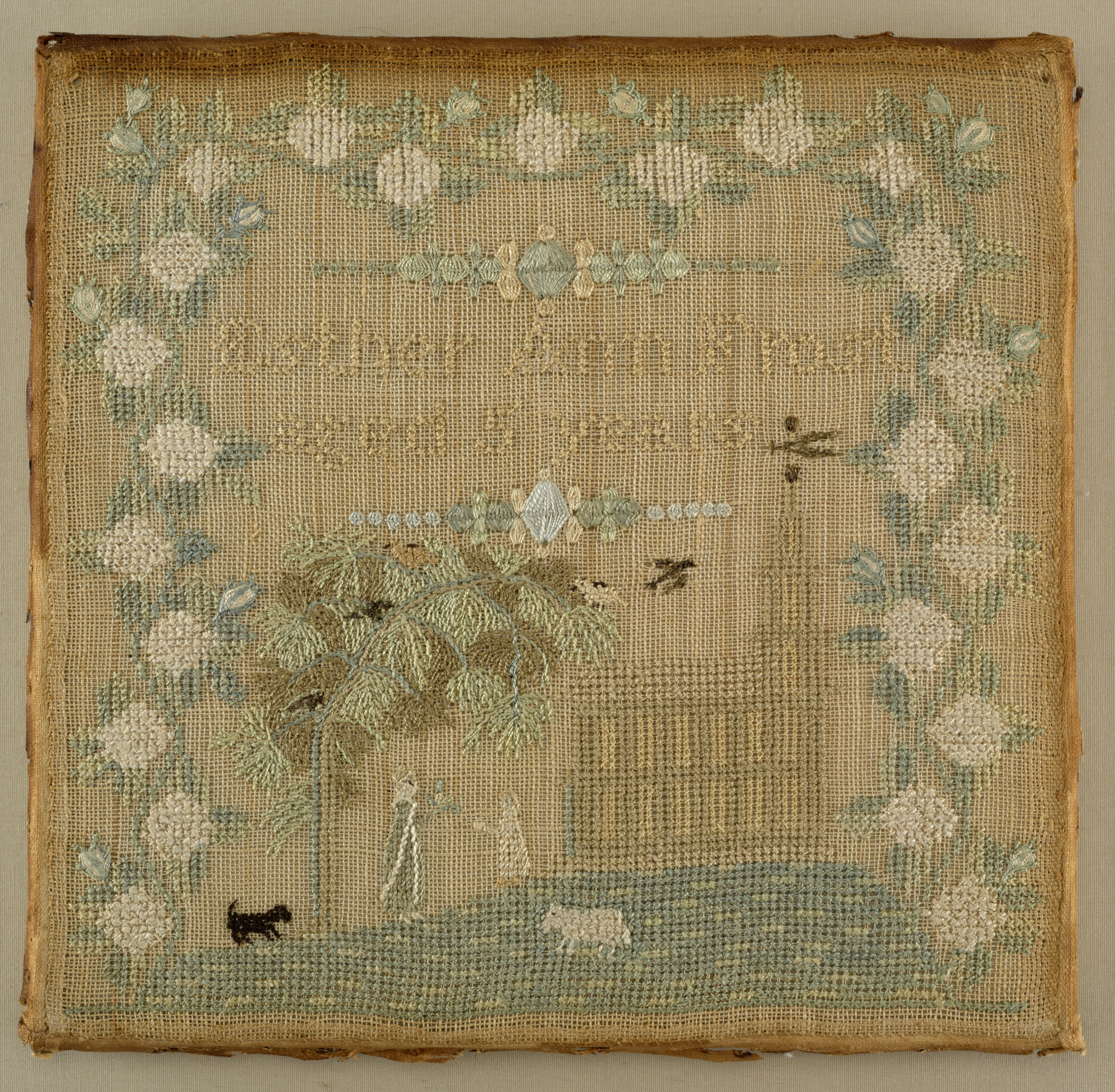 This is a Sampler. It was embroidered by Esther Ann Frost. It is dated ca. 1800 and we acquired it in 2008. Its medium is silk embroidery on linen warp, cotton weft and its technique is embroidered on plain weave foundation. It is a part of the Textiles department.