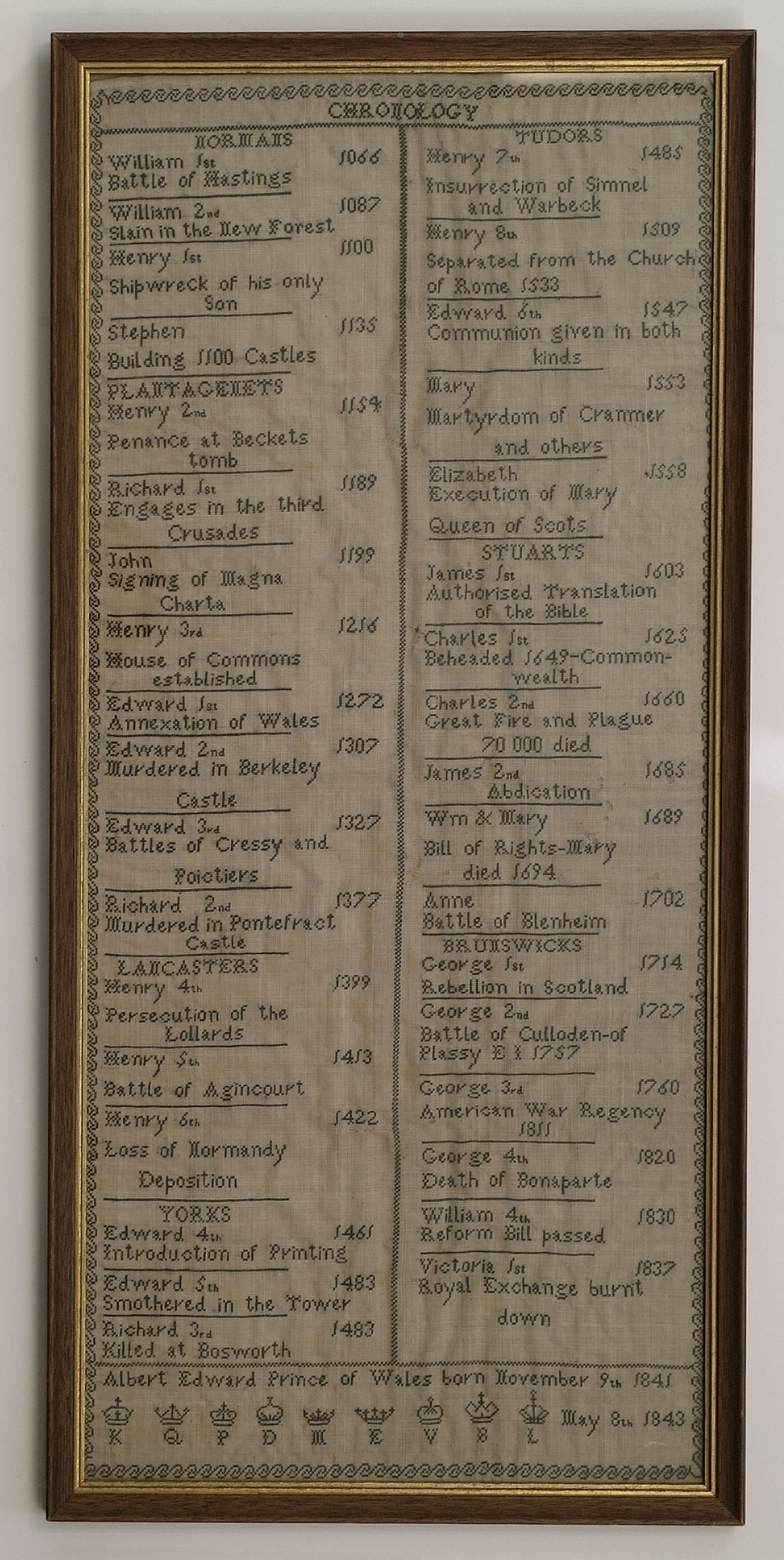 This is a Sampler. It is dated 1843 and we acquired it in 2008. Its medium is silk embroidery on linen foundation and its technique is cross stitch embroidery on plain weave. It is a part of the Textiles department.