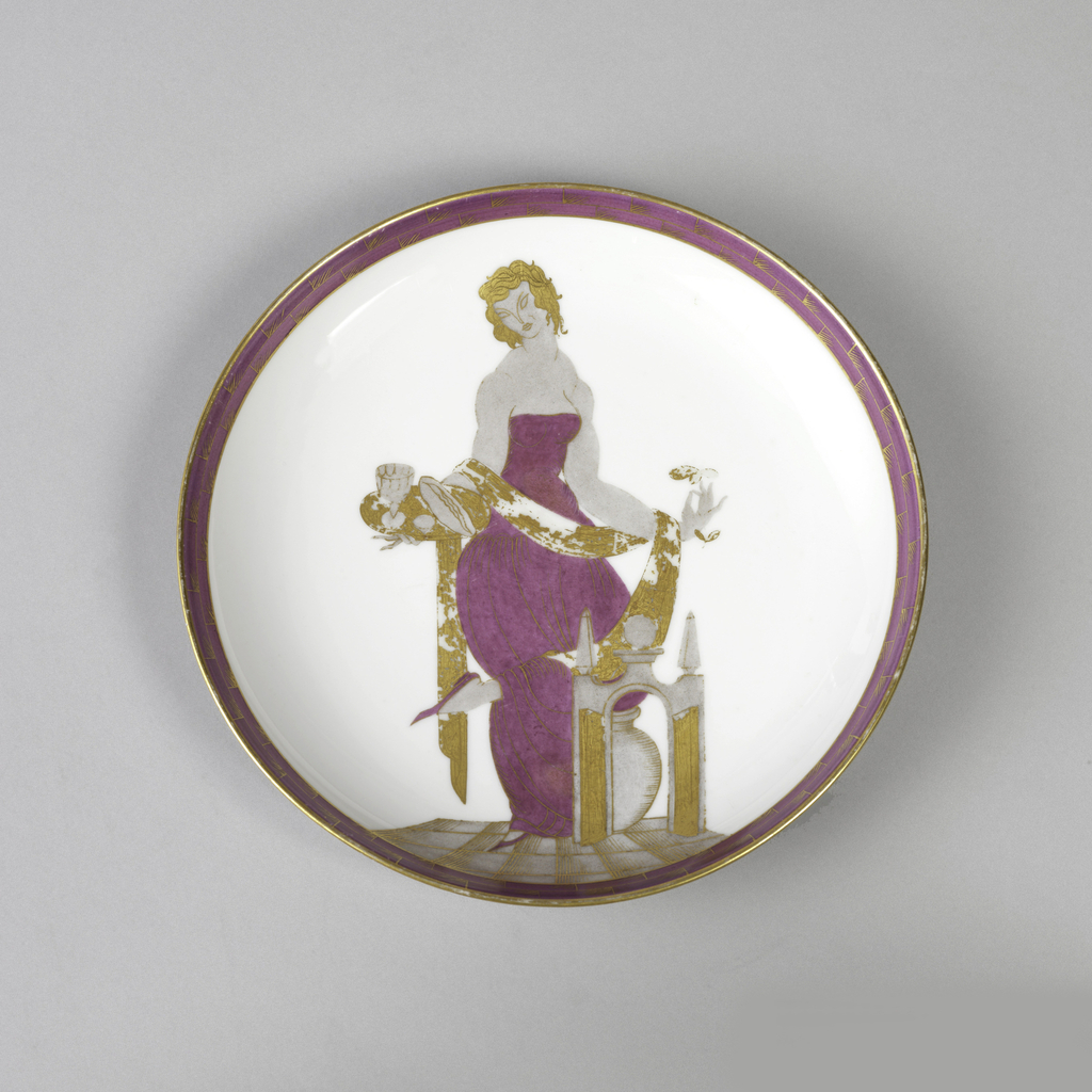 This circular plate is decorated in a style and palette similar to a series first exhibited by Ponti in 1923, called La passeggiata archeologica (An archeological stroll), consisting of figures with a flat appearance, identified by an attribute or a specific pose, often set against a white ground or gilded background pattern. In this plate, the classical references are more subtle, since the figure is dressed in what looks to be a modern gown and shoes. She holds a tray with a loaf of bread and goblet in one hand and a leafy sprig in the other. Before her is a small structure suggestive of an ecclesiastical portal composed of simple shapes in gray and gold.