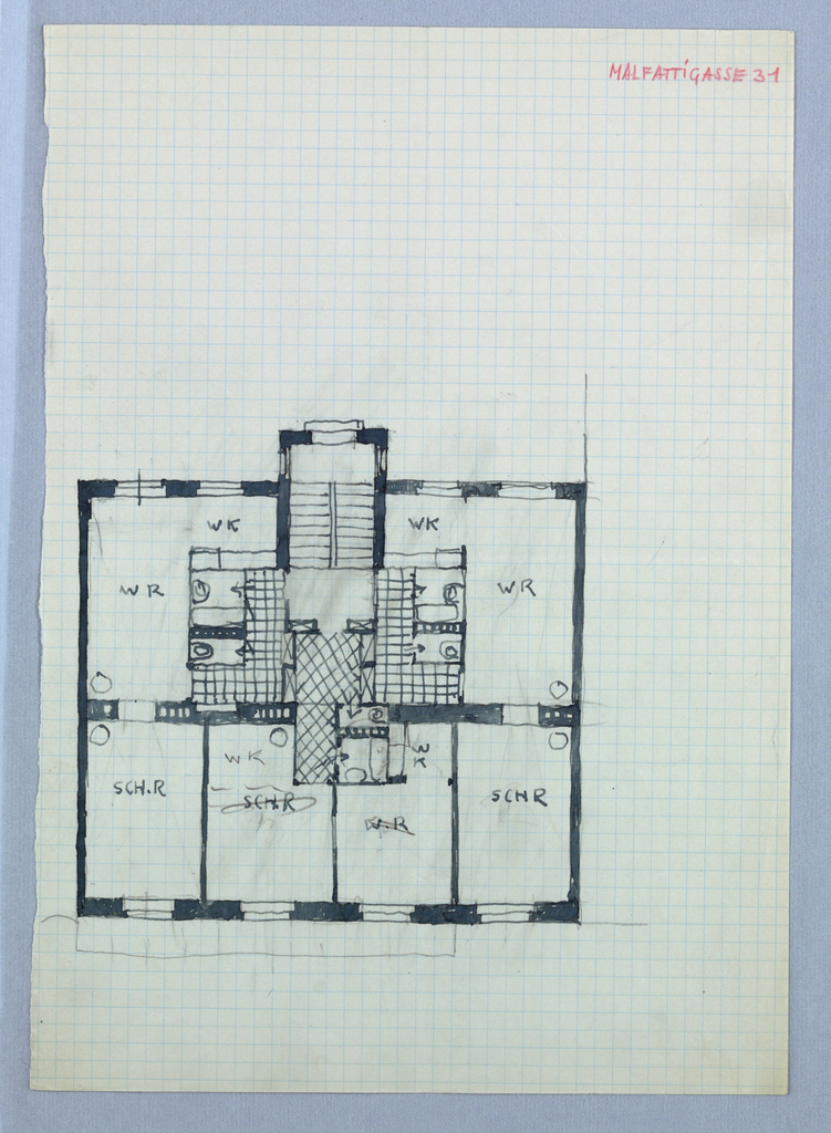 Drawing, Malfattigasse 31 (Floor Plan); Josef Hoffmann (Austrian, b. Moravia, 1870–1956); Austria; pen and dark gray ink, graphite, red pencil on graph paper; 29.7 x 21.1 cm (11 11/16 x 8 5/16 in.); Gift of Marilyn Walter Grounds; 2008-20-5