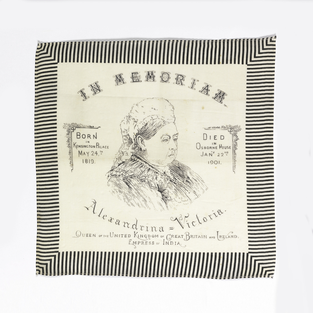 This kerchief is proposed for acquisition along with other souvenir fabrics, including a kerchief printed for the Golden Jubilee in 1887 and another printed for the Diamond Jubilee in 1897. As a group, these provide an excellent demonstration of how costly sets of printing blocks and rollers were repurposed for various designs. These pieces complement each other and expand upon the British souvenir fabrics currently held by the museum, including one dating from 1837 depicting the coronation and another yardage fabric from the 1897 celebrations.