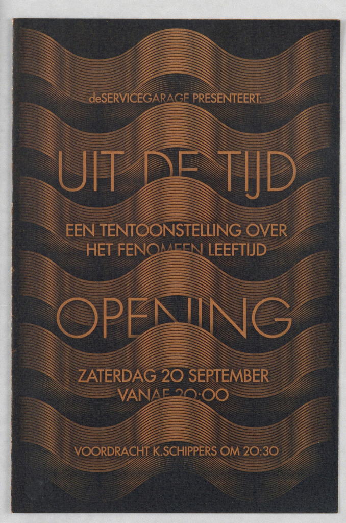 Flyer, Uit De Tijd: Een Tentoonstelling Over Het Fenomeen Leeftijd (Opening Invitation); Designed by Michiel Schuurman ((Dutch, b. 1974)); offset lithograph on bronze coated wove paper; Sheet: 19.8 x 26.2 cm (7 13/16 x 10 5/16 in.) folded in half; Gift of Michiel Schuurman; 2008-22-7