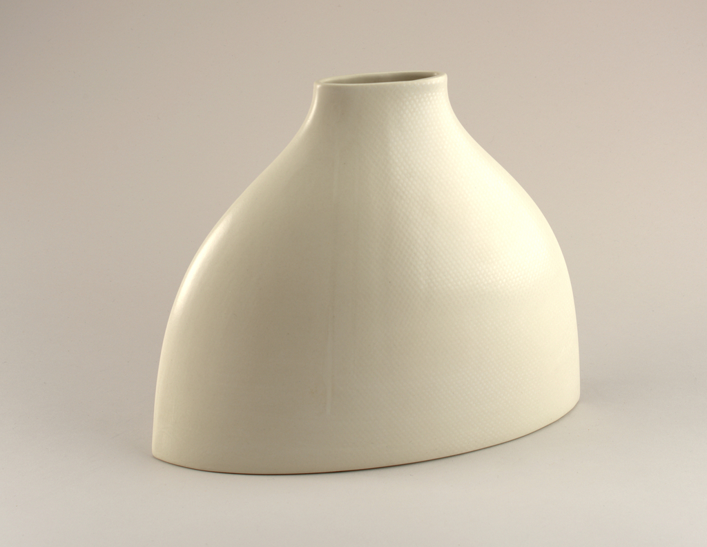 In the 1990s, Gulotta invited several American museums, including Cooper-Hewitt, to visit his studio and select examples of his work. At that time, the museum acquired cutlery patterns, glassware, a suite of his Chromatics tableware, and drawings for ceramics. The objects currently proposed for acquisition were selected by curators invited by Gulotta for another visit, which took place a few days before Gulotta shuttered his practice and retired to New Mexico. These vase prototypes, produced for the Portuguese manufacturer, Cerâmica São Bernardo, represent Gulotta’s experimentation with ceramic glazes and surface effects. The prototypes are in a celadon craquelure surface reminiscent of Asian ceramics, but also have a fish scale-like matte white surface achieved by spraying the glaze through a screen. Variations in the surface are a result of the way the ceramics worker finished the piece, holding the screen while applying the glaze. This rapid process is the same for each work, but each surface is unique.