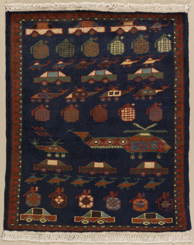 Both the Soviet Union (in 1979) and the United States (in 2001) have invaded Afghanistan. Between the Soviet withdrawal in 1989 and the start of the 21st-century War on Terror came a decade of brutal civil war. Through these decades of international and civil war, Afghans have borne witness to disaster by weaving unprecedented images of battles and weaponry into their rugs.