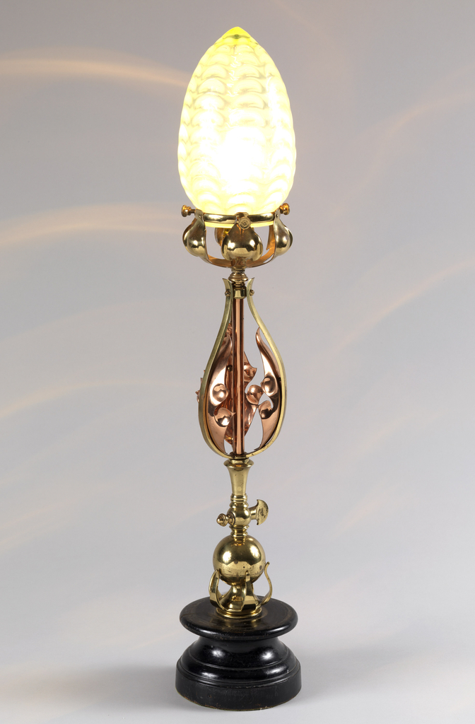 Benson’s use of modern machinery and his passion for the handmade Arts and Crafts approach is evident in this design. The decorative style of the copper and brass decoration forming plant leaves and the use of opalescent glass for the globe show Benson’s continued interest in artistry and new technology. Many of Benson’s electric lamp designs are based on an assembly of standard parts used in different ways depending on the function, which demonstrates his fascination with machinery in both design and production.