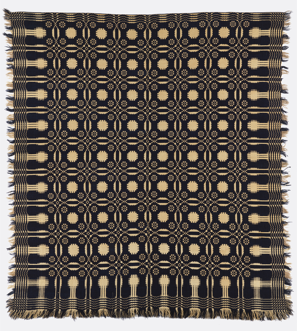 The American woven coverlet presents an appealing visual record of the patterns and designs of the 18th and 19th centuries. Prior to the arrival of the Jacquard attachment in the United States in the early 1820s, coverlets like this one were woven at home or in shops on small looms in narrow widths and were then whip stitched together to make a bed-size coverlet. Coverlets come in a variety of weave structures and frequently are double cloths, a technique introduced to the United States by weavers from the British Isles and Germany, who also brought their traditional European coverlet designs to the United States. The double cloth coverlet was woven mainly by professionals using a multi-shaft loom. It was the most expensive to weave given that the double warp and weft used a large quantity of yarn. This also made it the warmest of coverlets. To weave a coverlet with strong graphic motifs like those found on this particular coverlet would require a loom with up to 20 shafts. Geometric patterning predominates on coverlets from this period. Weavers referred to these graphic elements with names like stars, chains, roses, knots, and rings.