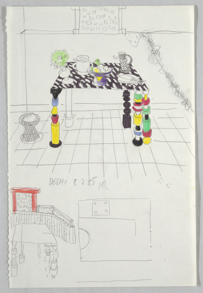 This is a Drawing. It was designed by Ettore Sottsass. It is dated February 8, 1985. Its medium is graphite, crayon, black marker on white wove paper. It is a part of the Drawings, Prints, and Graphic Design department.