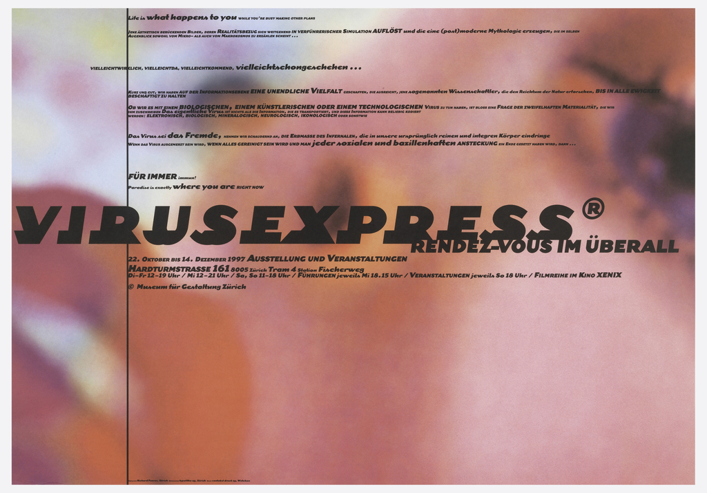 Poster, Virus Express - Rendezvous im Überall; Switzerland; offset lithograph on wove paper; 127.9 x 89.5 cm (50 3/8 x 35 1/4 in.); Gift of Sara and Marc Benda; 2010-21-107