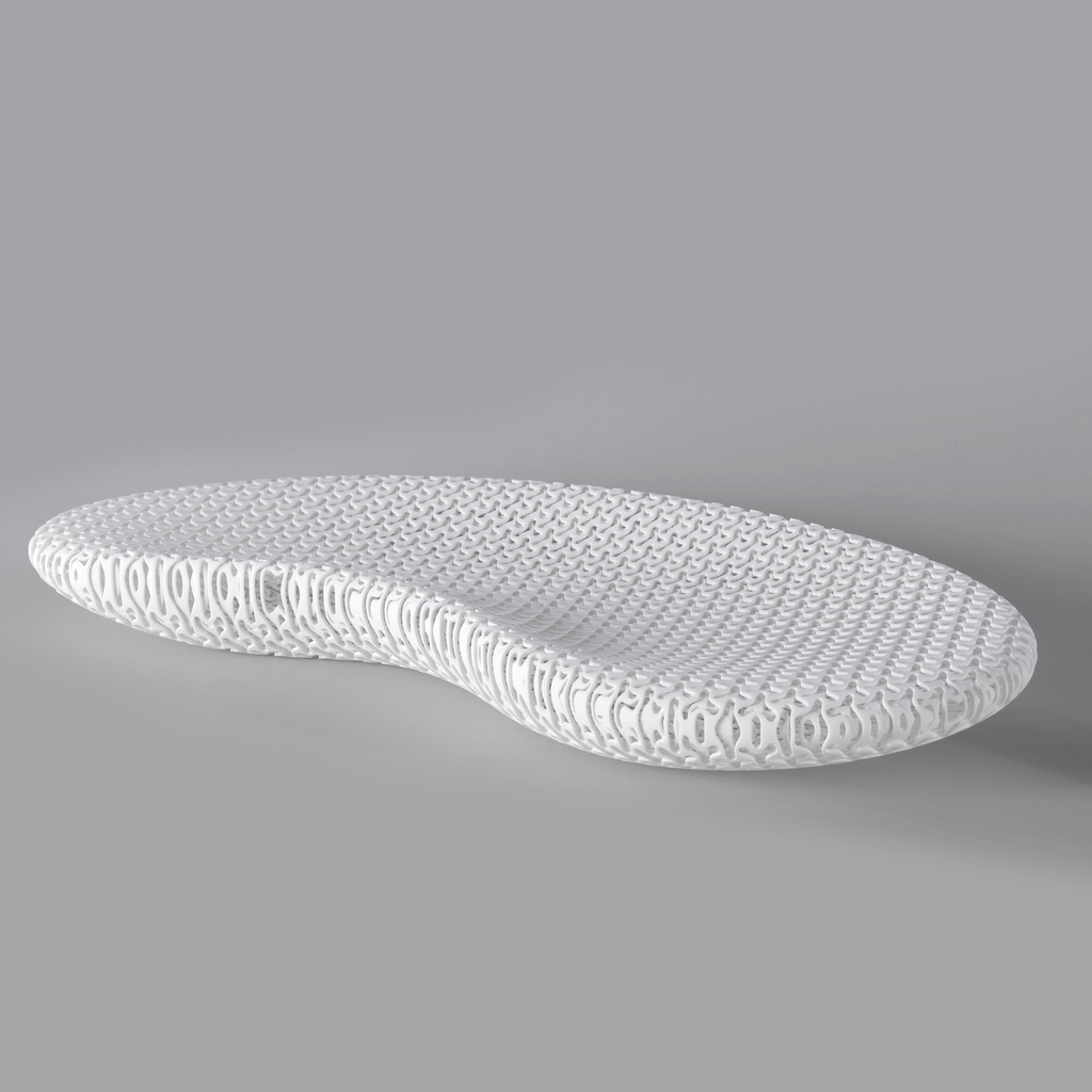 The Future Systems fruit bowl was produced via selective laser sintering (SLS), a process by which a computer controls a laser that heats and solidifies a polyamide powder upon contact, building up a form, minuscule layer by minuscule layer, into a single complete piece. The asymmetrically-shaped bowl is a study in complex geometry and severe curves, seemingly made up of multiple, pierced, and layered surfaces, curving in several directions at once. By using the SLS manufacturing method, the object is built up as a single piece, interstices and all, rather than made from concentric layers of material wrapped one over the other.