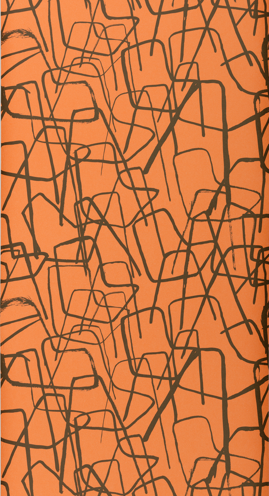 The design of overlapping chairs in this sidewall is abstract in its simplicity. The slight variations in scale and line weight give the design depth. The simple manner of illustration and the composition’s density prevent any single chair from standing out, while the bright orange ground demands attention.