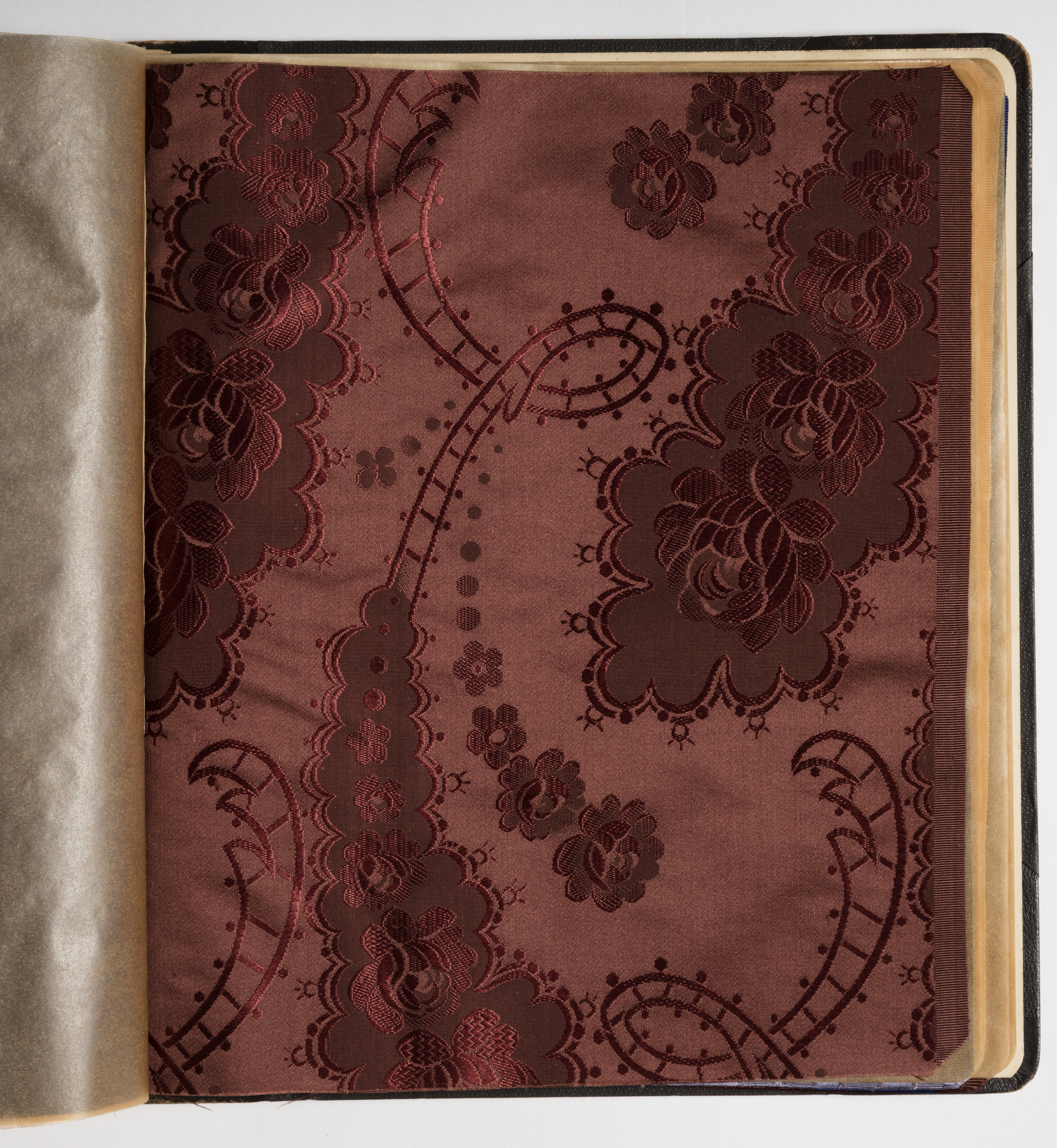 This is a Sample book. It is dated 1870–79 and we acquired it in 2011. Its medium is silk, paper, leather and its technique is jacquard woven samples, bound. It is a part of the Textiles department.