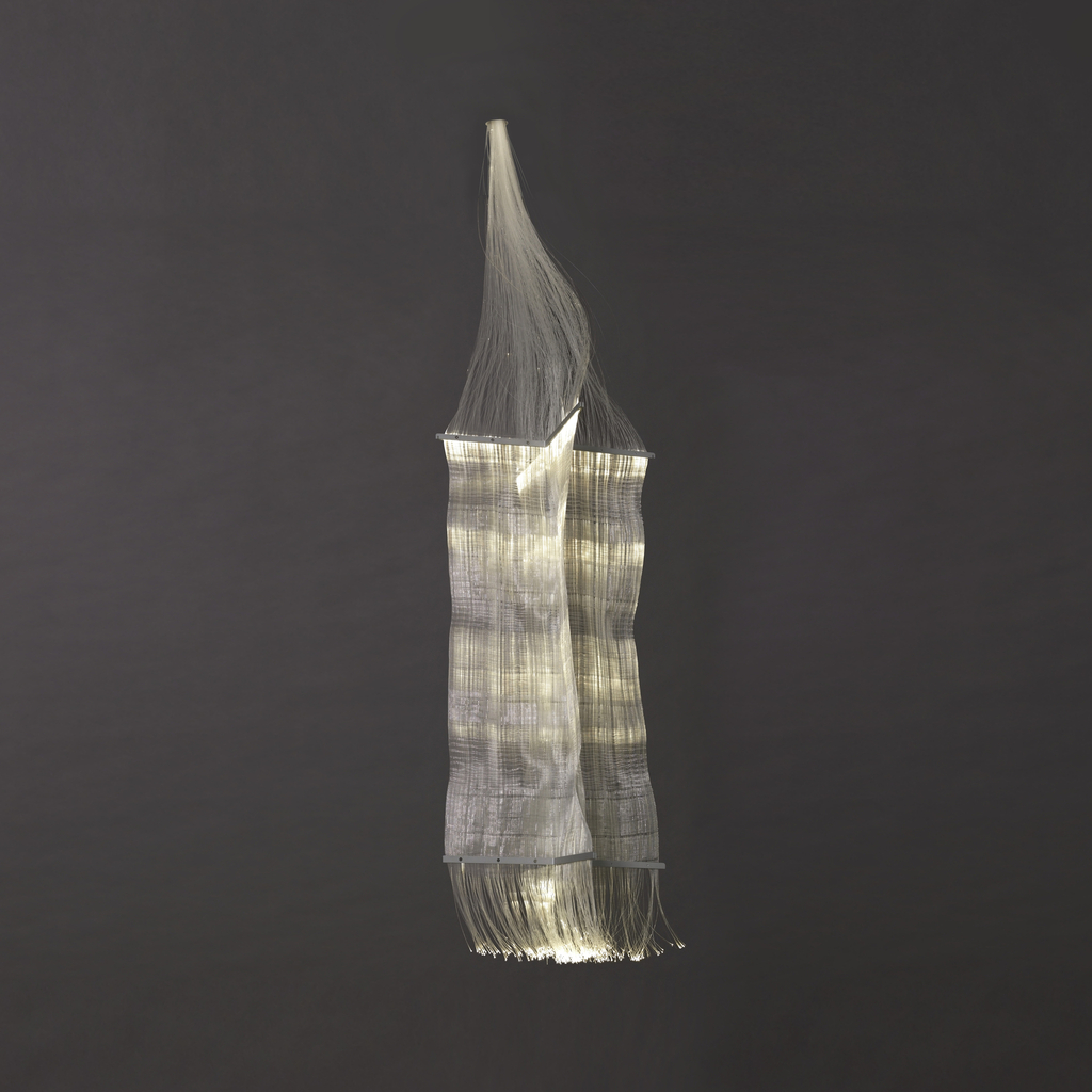 This is a pendant lamp. It was designed by Suzanne Tick and manufactured by Suzanne Tick Design Studio. It is dated 2004 and we acquired it in 2008. Its medium is double woven fiber optics and monofilament, metal. It is a part of the Product Design and Decorative Arts department.