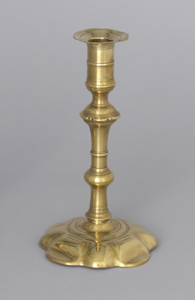 The 18th century was the most diverse period for brass candlestick shapes. The petal base on each candlestick is connected to a modified baluster stem. The bases’ undulating and shaped surfaces formed to catch light in a sparkling way, enhancing their effect both lit and unlit. The irregular outline of the petal shape is repeated in the knop on the stem and by the drip pan (bobeche) at the top, which also provides a play of light and reflects the rococo taste of their era. It was not till the mid-18th century that the prevalent baluster and column stems, brought over by the Huguenot silversmiths in the 1680s and 1690s, began to evolve into a variety of purely English types.