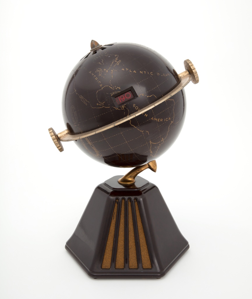 The globe-shaped radio depicts the seven continents, but omits individual country names. It was available in three different color combinations: black and gold, maroon and gold, and ivory and gold. The ivory and gold option was considered the “top of the line.” The radio’s speaker was located in the base; the metal ring played a dual role—one as the decorative indication of the earth’s equator and the other as the functional connector of the two metal knobs that controlled the power, volume, and station tuning. Advertisements deemed the radio “the ultimate in design.” The New World radio was a commercial success despite its high price point of $60 during the Great Depression. By using a globe’s shape and decoration, Loewy linked listening to the radio with the modern notion of connecting to the world. The radio’s form also alludes to the globe as a decorative motif in historical decorative arts, such as Renaissance automata like celestial globes with clockwork.
