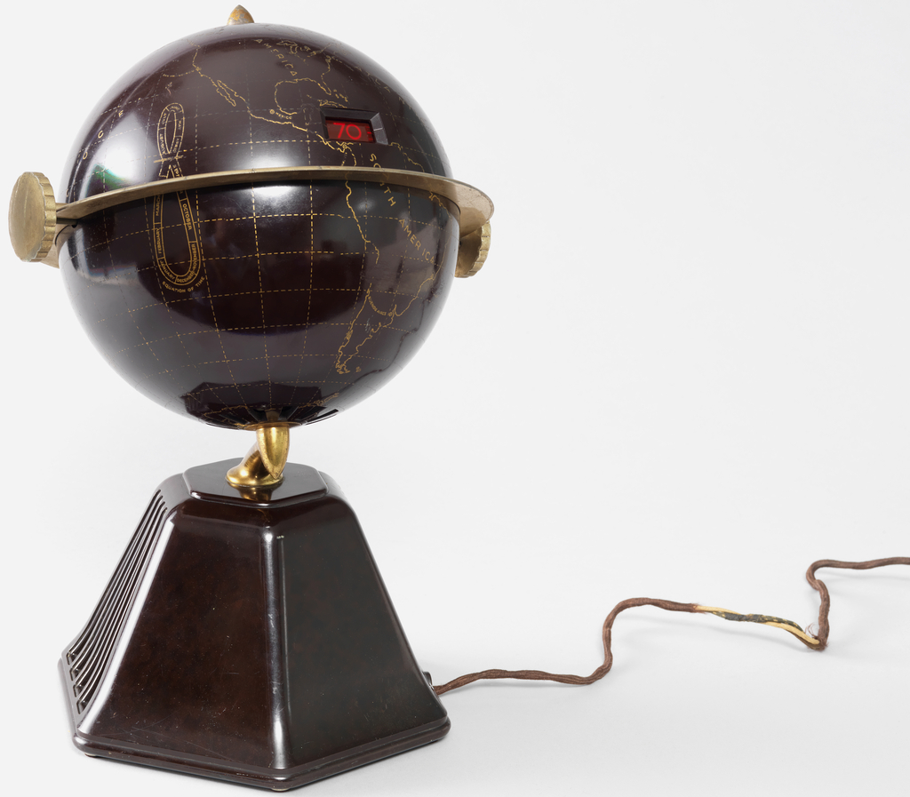The globe-shaped radio depicts the seven continents, but omits individual country names. It was available in three different color combinations: black and gold, maroon and gold, and ivory and gold. The ivory and gold option was considered the “top of the line.” The radio’s speaker was located in the base; the metal ring played a dual role—one as the decorative indication of the earth’s equator and the other as the functional connector of the two metal knobs that controlled the power, volume, and station tuning. Advertisements deemed the radio “the ultimate in design.” The New World radio was a commercial success despite its high price point of $60 during the Great Depression. By using a globe’s shape and decoration, Loewy linked listening to the radio with the modern notion of connecting to the world. The radio’s form also alludes to the globe as a decorative motif in historical decorative arts, such as Renaissance automata like celestial globes with clockwork.