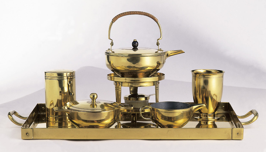 This is a tea set. It is dated ca. 1903 and we acquired it in 1986. Its medium is brass, copper, glass. It is a part of the Product Design and Decorative Arts department.