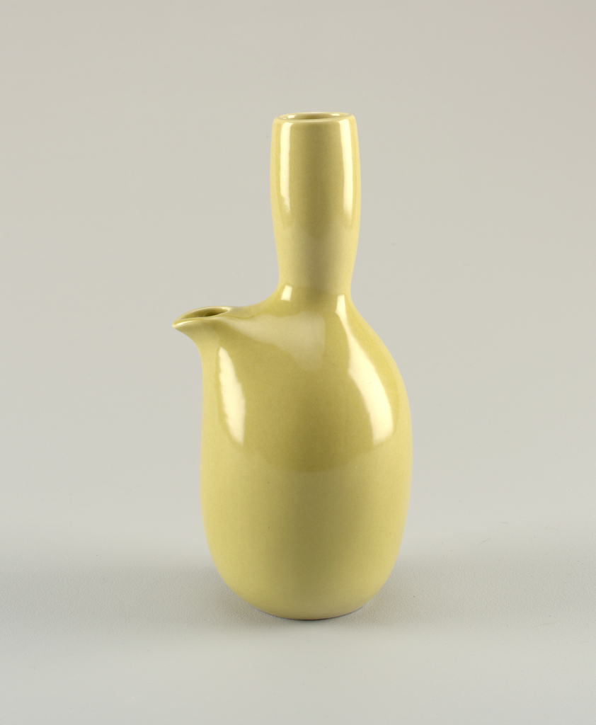 This is a Carafe. It was designed by Russel Wright and manufactured by Iroquois China Company. It is dated 1951-1969 and we acquired it in 1982. Its medium is glazed earthenware. It is a part of the Product Design and Decorative Arts department.