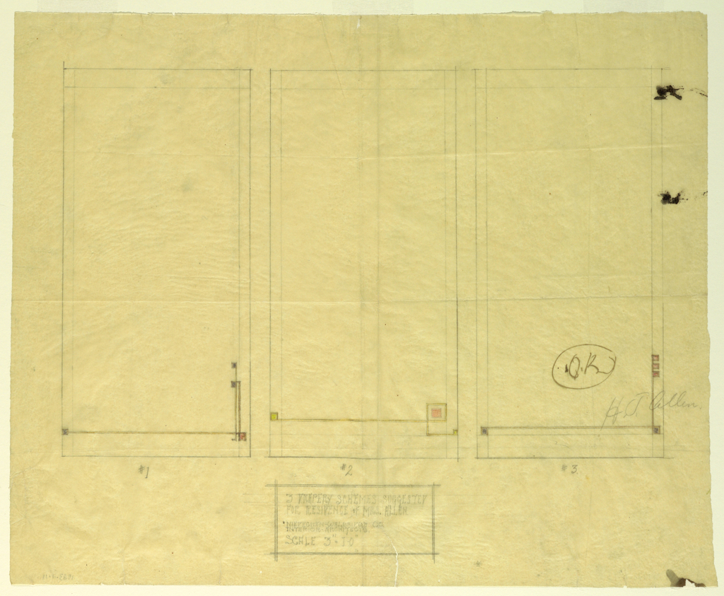 Inscribed in graphite within ruled border, lower middle: 3 DRAPERY SCHEMES SUGGESTED/ FOR RESIDENCE OF MRS. ALLEN/NIEDECKEN-WALBRIDGE CO./ INTERIOR-ARCHITECTS/SCALE 3" = 1'0" (all underlined); inscribed below design: #1/#2#3 (all underlined); in pen and green-black ink, right: OK (underlined); in graphite: H. J. Allen (all underlined)