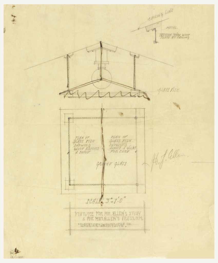 Inscribed in graphite, right margin: H. J. Allen; CEILING LINE / METAL / SECTION THRU WOOD / PLATE AT CEILING; center left: PLAN OF / GLASS DISK / SHOWING / WOOD BLOCKS / & CORD; center right: PLAN OF / GLASS DISK / SHOWING / LINES & HOLDS / FOR CORD / GROONE GLASS; lower center: SCALE 3"=7'-0" / FIXTURE FOR MR. ALLEN'S STUDY / & FOR MRS. ALLEN'S DRESS. RM. / NIEDECKEN CO. / INTERIOR-ARCHITECTS.