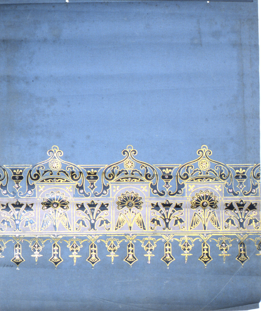 This is a Window shade. It is dated 1880–1900 and we acquired it in 1983. Its medium is block-printed. It is a part of the Wallcoverings department.
