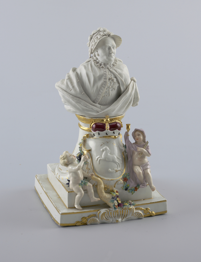 This is a Bust. It was manufactured by Fürstenberg Porcelain Manufactory and modeled by Johann Christof Rombrich. It is dated ca. 1771 and we acquired it in 1984. Its medium is biscuit, hard paste porcelain, vitreous enamel, gold. It is a part of the Product Design and Decorative Arts department.