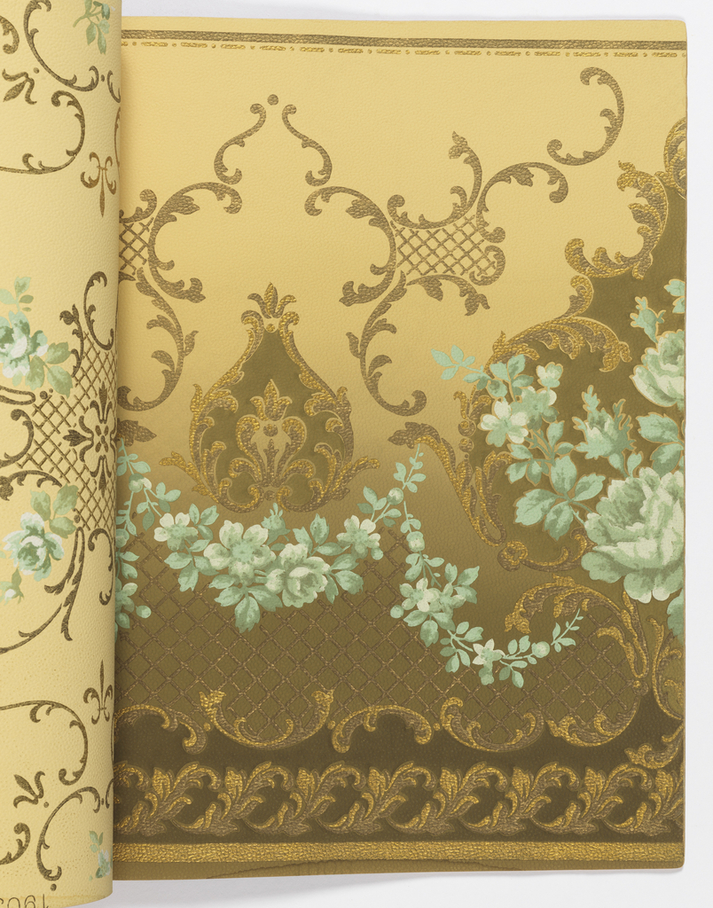 This is a Sample book. It was produced by Alfred Peats Company. It is dated 1906 and we acquired it in 1984. Its medium is machine-printed paper, liquid mica. It is a part of the Wallcoverings department.