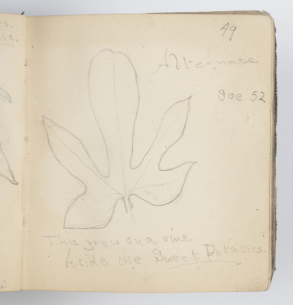 Recto: Inscribed in graphite, below leaf: "This grew on a vine / beside the Sweet Potatoes."; upper right: "49 / Alternate / see 52". Verso: Inscribed in graphite, center left: "50"; upper left: "young / leaf"; below leaves: "Barelayana- / Alternate. / Flowers and Shoots / from leaf joints."