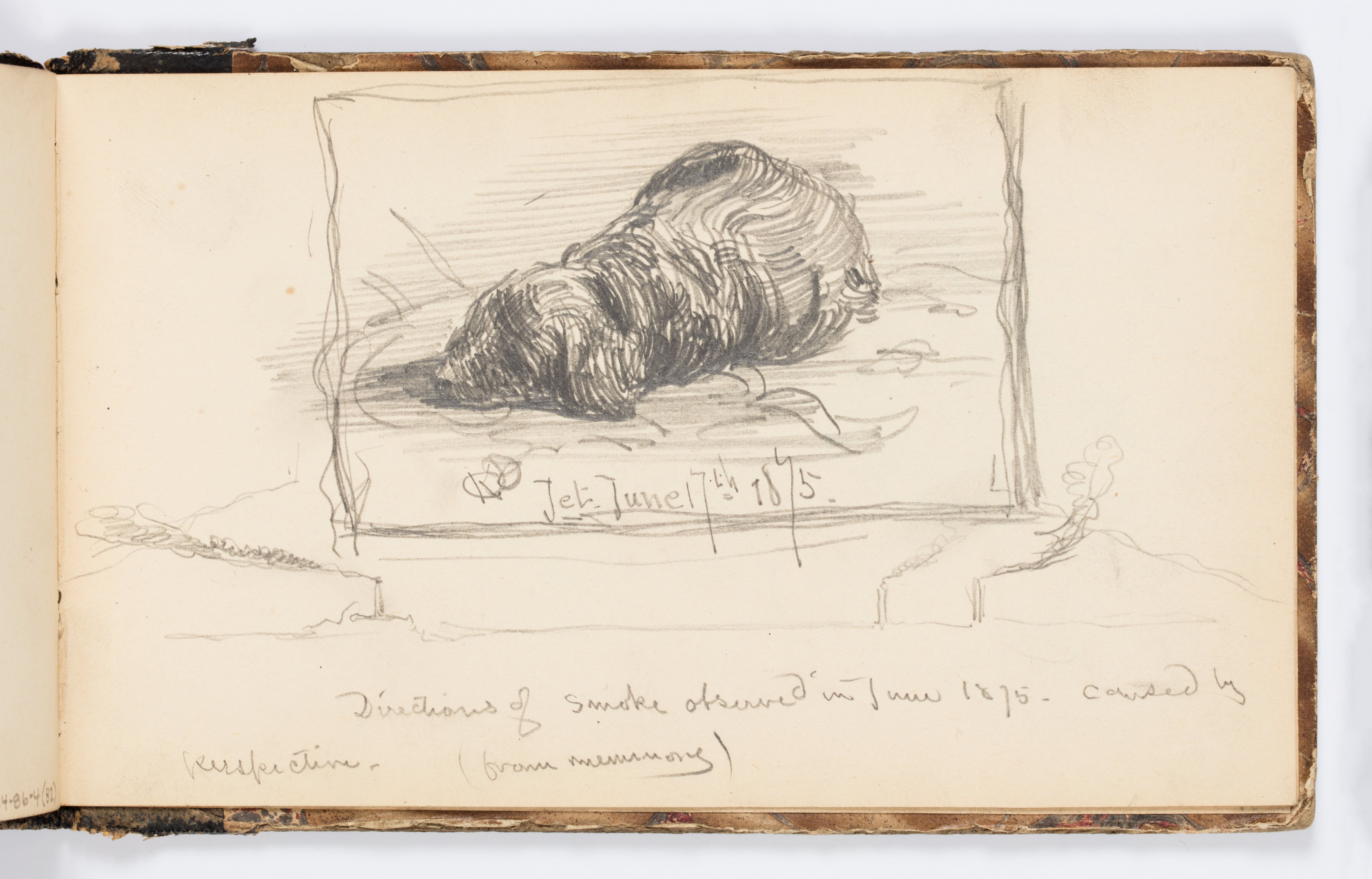 Inscribed in graphite, below dog: "Jet June 17th 1875."; along bottom of page: "Directions of smoke observed in June 1875. caused by / perspective. (from memmory)" [sic]
