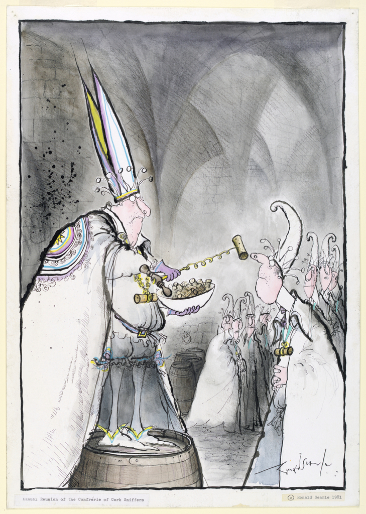 Typed in black ink on paper affixed at lower left margin: Annual Reunion of the Confrerie of Cork Sniffers; at lower right margin: © Ronald Searle 1981