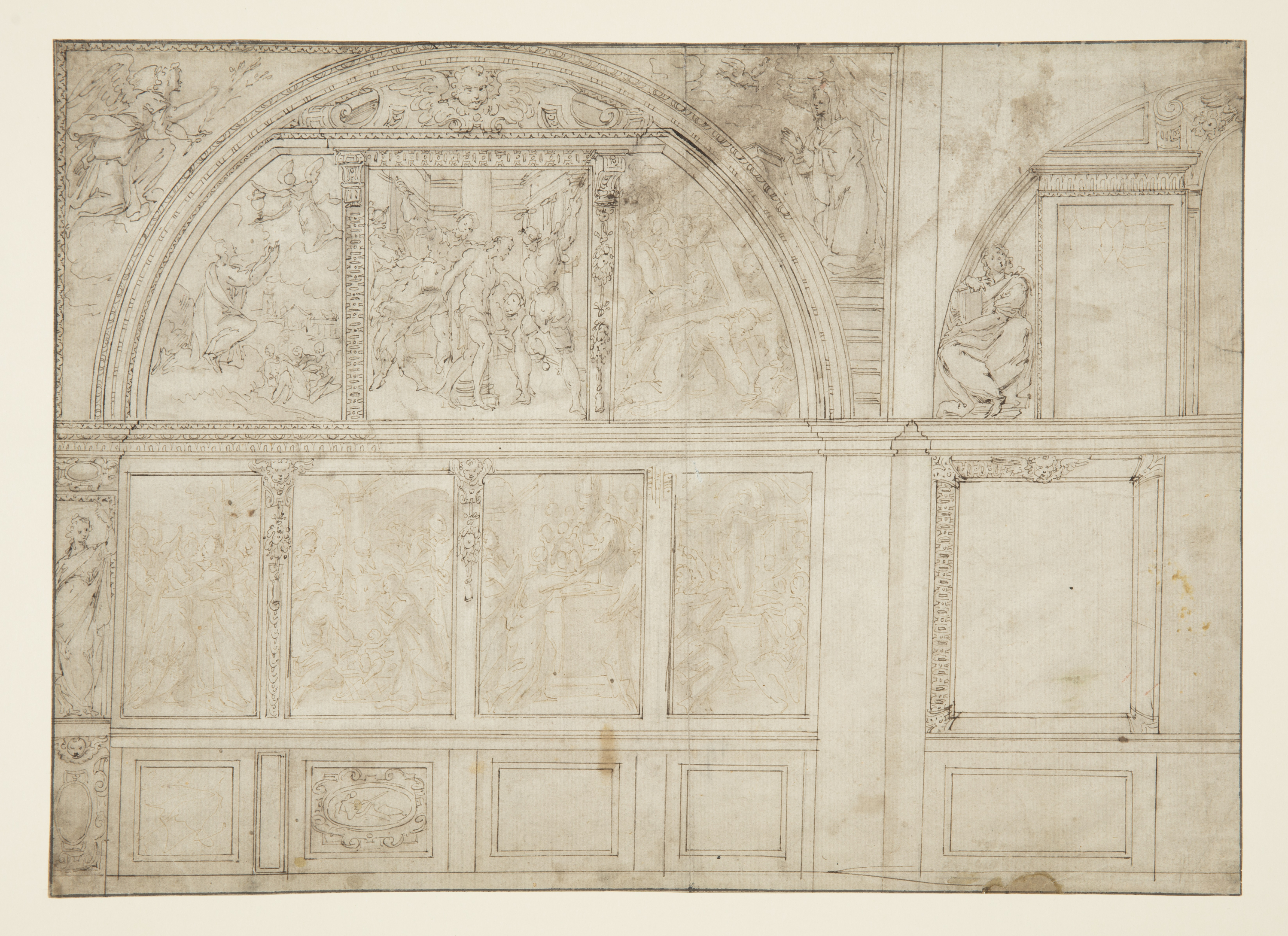 Drawing, Design for a Chapel Wall; Giovanni Battista della Rovere (Italian, ca. 1561–ca. 1630); Italy; pen and brown ink, brush and gray wash on beige prepared paper; 28.2 × 39 cm (11 1/8 × 15 3/8 in.); Museum purchase from General Acquisitions Endowment Fund; 1984-94-1