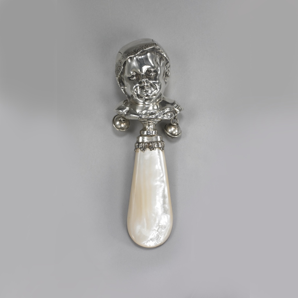 Baby Rattle with Bust of a Baby in a Nightcap Baby Rattle; USA; silver, mother of pearl; H x W x D: 11.9 × 4.1 × 2.8 cm (4 11/16 × 1 5/8 × 1 1/8 in.); Gift of Dorothy Warren; 1985-1-1