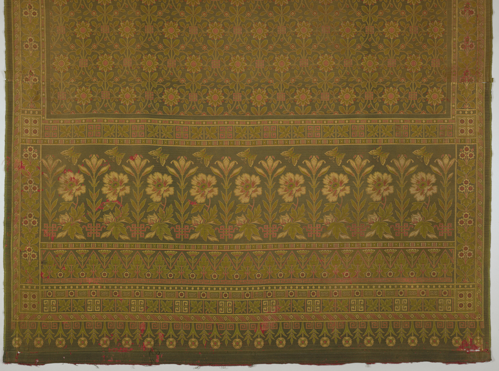 This is a panel. It was designed by Bruce James Talbert. It is dated ca. 1870 and we acquired it in 1985. Its medium is cotton, linen, wool and its technique is 2 & 2 broken twill and 1\3 twill with complementary wefts (yellow linen, green wool and brown wool) and inner warps (red cotton). the inner warps float or interlace on the front. only the areas which are green are 1\3 twill. It is a part of the Textiles department.