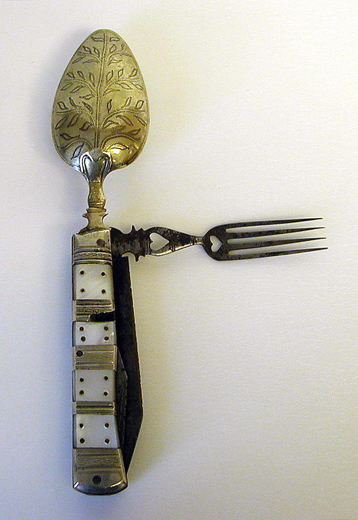 Folding Cutlery Set Folding Cutlery Set; Scandanavia or Germany; steel, brass, mother of pearl; L x W x D (folded): 12 × 4.6 × 3.7 cm (4 3/4 × 1 13/16 × 1 7/16 in.) L x W x D (opened): 21.9 × 4.6 × 2.5 cm (8 5/8 in. × 1 13/16 in. × 1 in.); The Robert L. Metzenberg Collection, gift of Eleanor L. Metzenberg; 1985-103-135