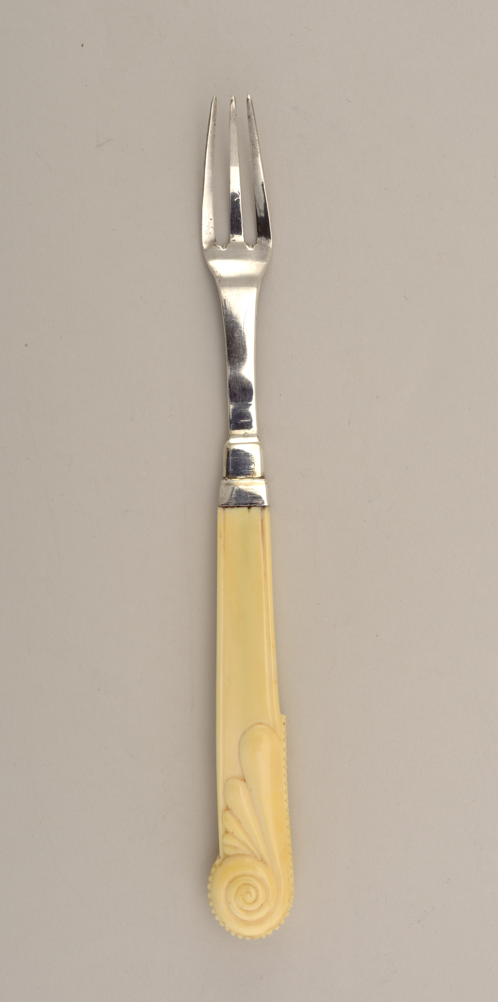 This is a fork. It is dated ca. 1798–1809 and we acquired it in 1985. Its medium is ivory, silver. It is a part of the Product Design and Decorative Arts department.