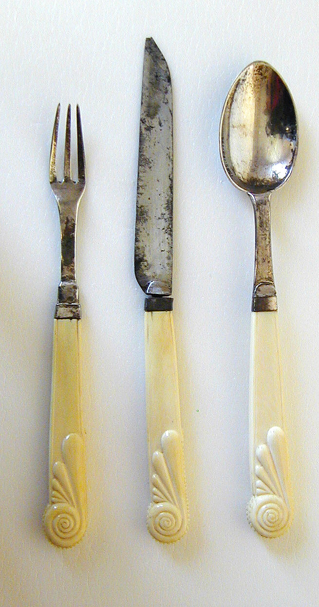 "Althought it was the norm for individuals to travel with cutlery and other flatware until the late seventeenth and early eighteenth century, this custom did not die out when hosts started to provide flatware for their guests. Traveling sets continued to be used when visiting inns, as exemplified by Celia Fiennes's will cited above, and for picnics, hunts, and other outdoor occasions, well into the twentieth century. The sets often were hinged to fold ( figs. 50, 51), and may have had fittings on the spoon to hold the tines (fig. 52) rather than having small or removable handles as earlier pieces did. Fancier sets sometimes included the addition of a beaker, and such amenities as salt, pepper or mustard holders fitted in a leather case (fig. 53). In other sets, both handles had pockets to recieve the blades or tines of the other implement, so when shut they formed an etui (fig. 54).